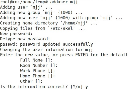如图所示,adduser mjj为新建一个叫做mjj的用户,由于此前并没有除了root之外的用户,所以会使用这个名字作为group/组的名字,并且在/home文件夹里面生成一个mjj文件夹,即mjj的”桌面“。所以输入两次密码,之后会问一堆问题,都是例行的,一路enter就好,最后会问一下信息对不对,输入y就完成添加新用户了。