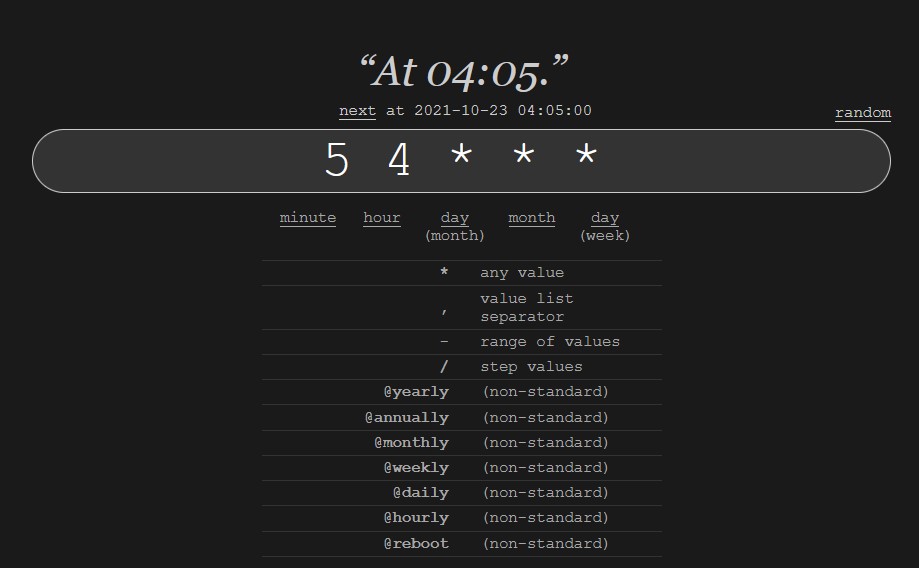 如上图,将每隔15分钟,就会使用位于usr/bin中的python3运行位于/usr/local/weather中的weather.py程序。前五个星号其实是设置的时间,推荐去 https://crontab.guru/ 这里直接设置时间(如下图)。第一个星号是分钟,第二个星号是小时,第三个星号是天,第四个星号是月份,第五个星号是每周的第几天。