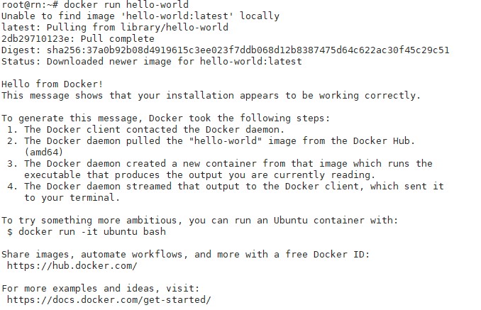 期间会下载几百兆的文件,网络不好的话,可能会需要一段时间,当完成安装后,使用docker run hello-world命令来测试功能是否正常,理论上会输出下图内容: