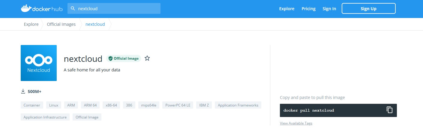 在 https://hub.docker.com/ 中直接搜索Nextcloud,找到官方版本的镜像,点击进去,在右侧有拉取镜像的命令,直接运行即可。