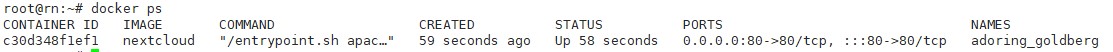 使用docker run -d -p 80:80 nextcloud 运行,此时使用docker ps可以查看到具体的详细信息