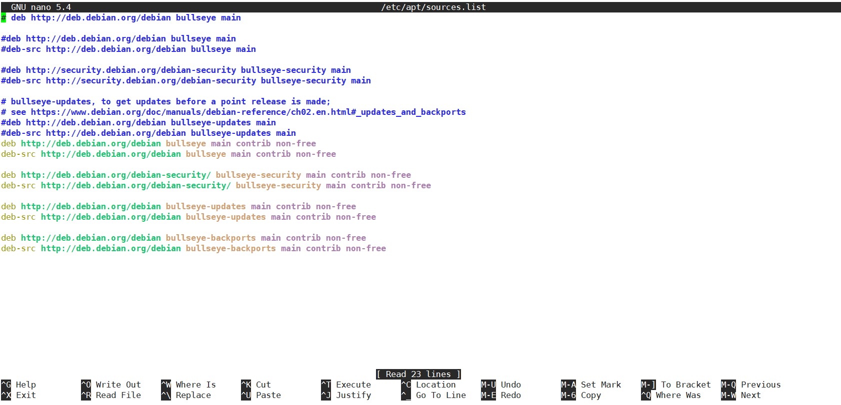 Linux系统的一大优势(同时也是劣势)是默认不需要GUI,因此节省了大量的性能开支,无GUI版本的Debian 11可以在512M甚至更小内存的VPS上正常启动和运行。但缺少GUI加大了入门者修改文件的难度,所幸Debian 11自带了简便易用的nano文本编辑器。以下以修改系统的更新源为例