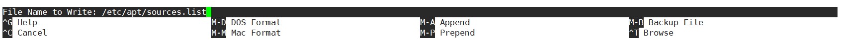 如图所示,即为nano打开sources.list后的界面,最下面两行为提示,比如Ctrl+E为退出,如果文档被改动了,则会出现下图,询问是否保存。如果没有被更改,则会直接退出。