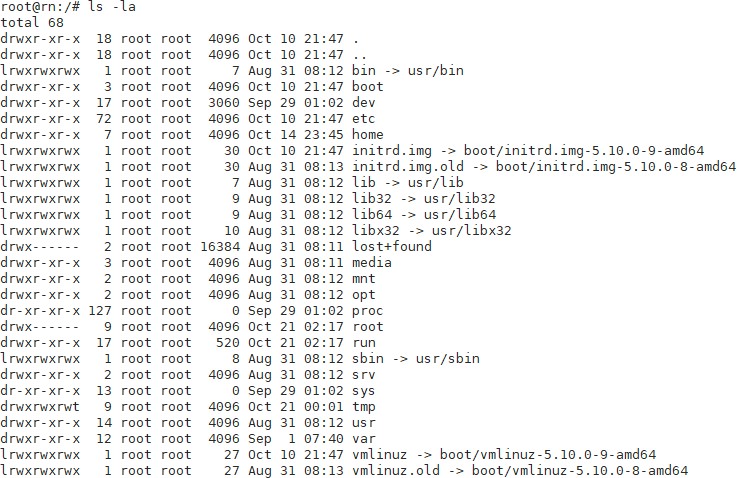 在/目录下,使用ls -la会显示出所有的文件和文件夹(如下图所示),a是列出所有文件,l是显示详细信息。