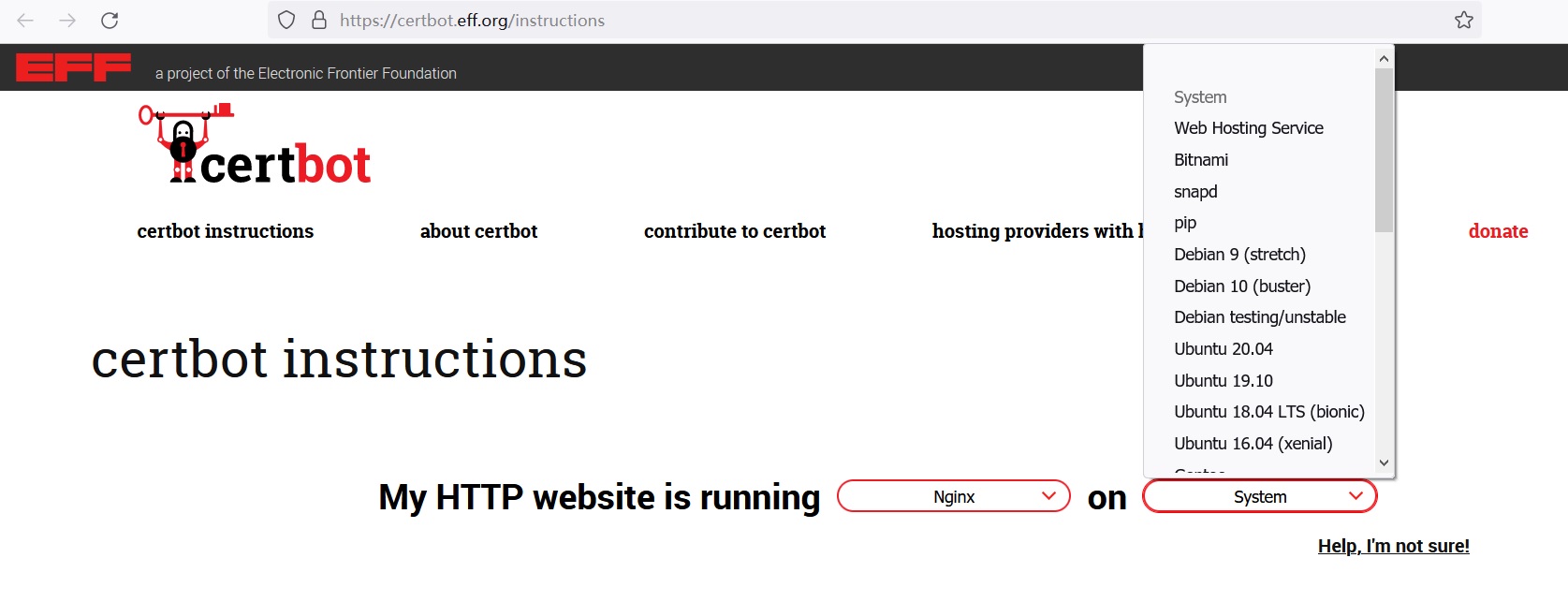 SSL/TLS证书是个垄断行业,电脑内置的证书就那么几家,如果想网站被大多数浏览器/系统接受,那就只能去申请其中某家的证书,这里面层层签发转售,几近无本万利。不过好在还是有很多免费的SSL/TLS证书的,比如Let’s Encrypt提供三个月的免费证书,而亚洲诚信通过第三方公司,提供一年免费的证书。这里以Let’s Encrypt为例演示,相关链接为 https://certbot.eff.org/instructions :