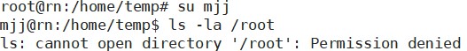 但此时,mjj这个用户的权限是很小的,四舍五入等于没有,连某些文件夹都不能进去更别说执行软件了。使用su mjj切换到mjj用户中,可以在终端中看到已经从root@rn变成了mjj@rn,rn是这台服务器的名字,即为某某在rn这台服务器上。查看以下root文件夹下有些什么东西,结果发现权限不够而被拒绝访问/Permission denied。