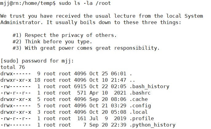 此时,我们再切换到mjj用户上,在刚才的命令前加上sudo,临时获取root权限,就可以查看了: