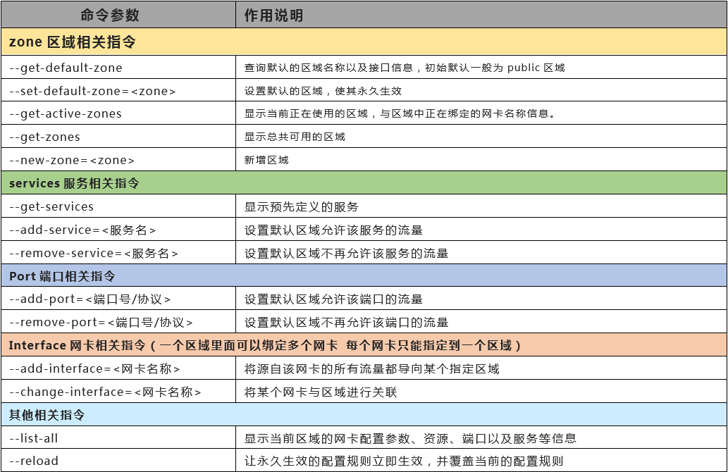 firewalld防火墙,在图形界面是firewall-config工具,在命令行模式下是firewall-cmd命令。常用的命令如下: