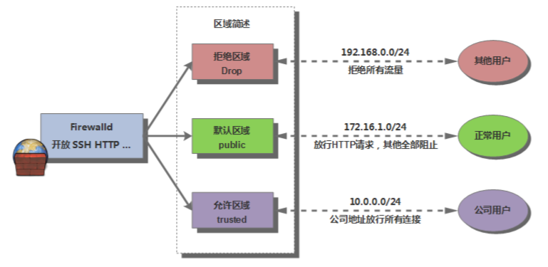 firewalld一共有9个官方的预定义区,用户还可以自定义区域,对于小白来说,重点记住public、trusted、drop 这三个区。